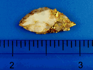 Here is a nice piece of natural gold in quartz. It has been cut smooth on both sides, which exposed a nice scattering of gold veins on one side of the piece. It weighs 1.16 grams.