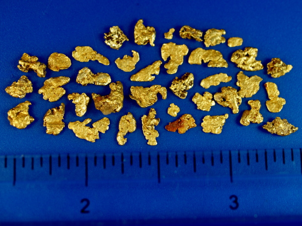 A beautiful collection of small gold nuggets that were mined this summer up near Fairbanks, Alaska. They have a combined weight of 3.99 grams.