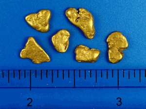 Six chunky gold nuggets from Southern Oregon. They have a combined weight of 4.63 grams.