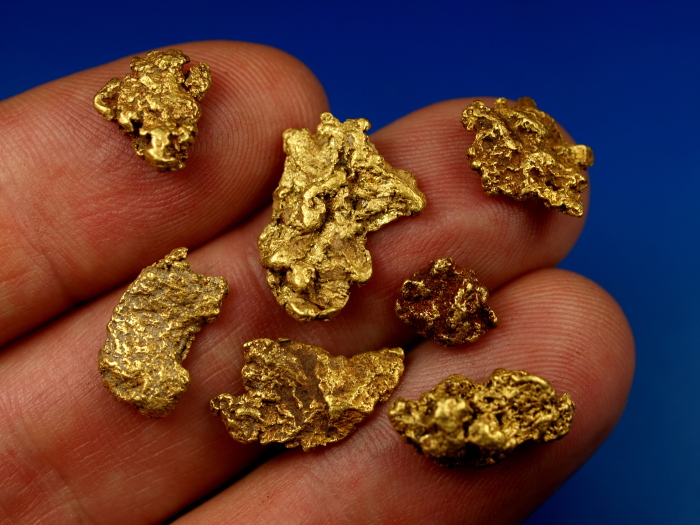 A nice collection of smaller gold nuggets from Fairbanks, Alaska. Their combined weight is 9.39 grams.